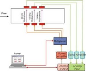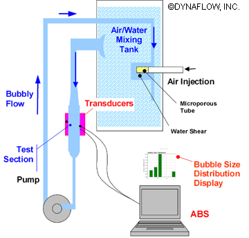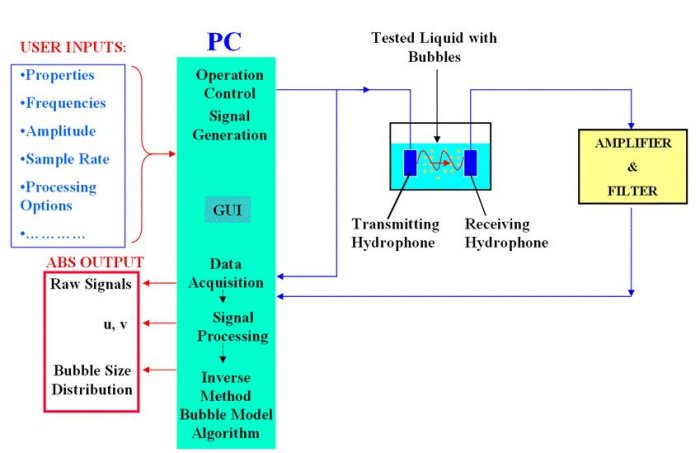 The device extracts the bubble population from acoustical measurements made at several frequencies. It consists of a set of two transducers/hydrophones connected to a computer. A data acquisition board controls the hydrophones` signal generation and acquisition. The PC is also used for analysis of the data and provides, using Dynaflows`s software, the sound speed and attenuation as a function of frequency.
