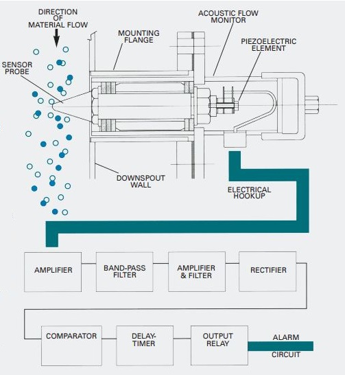 As material flows through the downspout, sonic waves are generated at the friction interface between the material and downspout wall, material and sensor probe, and by material particles moving against one another.This sound vibration is transmitted as a physical motion through the tip of the sensor probe.This motion is proportionally converted by a piezoelectric element to an electrical signal, which is forwarded to the control unit. Within the control unit, the signal is amplified and filtered to eliminate non-flow related interference.The incoming signal activates and maintains a "material motion" status. In the event of an empty downspout or one full or partially loaded with non-moving material, the "material motion" signal drops below a set point, providing a contact closure showing pluggage has occurred. An adjustable 10 to 90 second time delay is included in the circuit to prevent nuisance alarms caused by spike vibratory conditions
