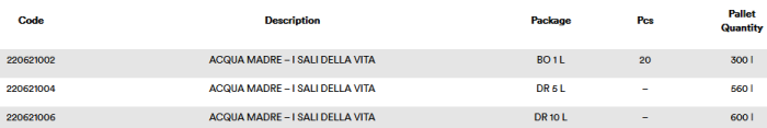 Balanced mix of magnesium and potassium mineral salts and bio- trace elements to Reconstruct homeostatic solutions for bathing purposes. Contains anti-scale agents. The liquid formulation of the Acqua Madre makes it easier to dissolve the product thus Preventing dosing errors.