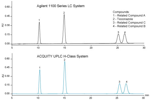 Achieving true UPLC performance requires that system dispersion (or extra-column band spread) be matched to the peak widths associated with narrowbore columns packed with sub-2-μm particles. While other systems might be designed for high pressure, it doesn’t mean they`re designed to deliver the sharp peaks associated with UPLC performance and the ACQUITY UPLC H-Class System.