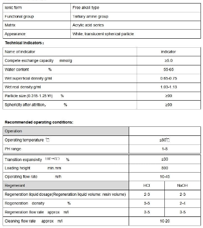 This product is a new type or anion exchange resin with methyl tert amine group, which is on the acrylic matrix The resin Is featured by good physical and chemical property, last speed of ion exchange, large exchange capacity, low regenerating agent consumption, high performance on the resistance to organic pollution and good mechanic strength and etc. It is mainly used in the refining process and decolorization of citric acid, lactic acid, (laconic acid and other organic acids as well as liquid glucose. Vitamin C with the removal of inorganic Ions such as S042-> CI- and etc.