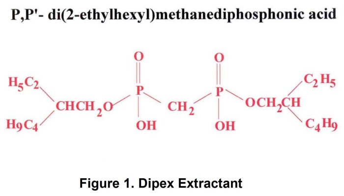 Eichrom’s Actinide Resin is based on the DIPEX® Extractant shown in Figure 1. The resin exhibits an extraordinarily high affinity for the actinide elements (Figure 2.) For acid concentrations less than 1M, the retention of actinides is dramatically higher on Actinide Resin than on TRU Resin. This makes the resin quite useful for the preconcentration of actinides out of large volume aqueous samples and for monitoring actinides in aqueous discharges. The resin may be batch contacted with an aqueous sample and then counted directly by liquid scintillation for a very rapid analysis.