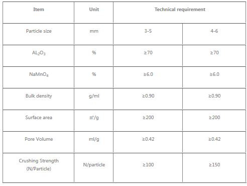 XR2007 I Activated alumina impregnated with Sodium permanganate(NaMNO4) media is a chemisorbent, filtering by adsorption and then oxidation. It is gradually used in the field of fresh vegetables and other areas.XR2007 I impregnated activated alumina with NaMNO4 media is a high surface area activated alumina pellet, impregnated with Sodium permanganate during its manufacturing. The result is a chemical filter with highly enhanced performance in removing Hydrogen Sulfide (H2S), Sulfur Dioxide (SO2), Nitrogen Dioxide (NO2), Mercaptans and ethylene. It is the three times than immersion KMNO4 impregnated activated alumina with immersion technology.