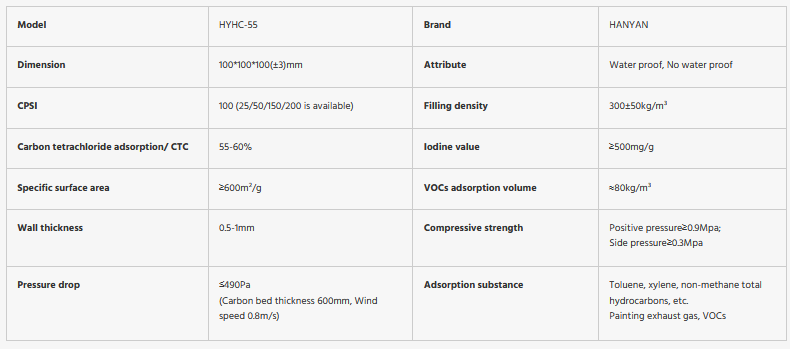 HANYAN patented two-step activation honeycomb activated carbon is a new popular kind of activated carbon, which widely used in various VOCs purification systems with low concentration and large air volume. HYHC-55 is the most cost-effective honeycomb activated carbon, can meet most of customers’ exhaust emission requirements.
