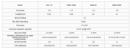 - The GAC filter element can be compacted by filling with activated carbon filter material and a specially designed sponge inside. The PP melt-blown filter layer at the end of 20um can effectively prevent the fine particles from seeping out.