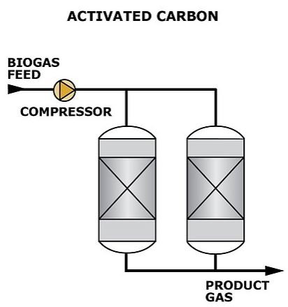 The system consists of a minimum of two towers, each having a bed of activated carbon. The gas travels through the carbon bed from bottom to top. Pressure drop through the bed and outlet concentrations are monitored to alert to a change in performance signaling the need to replace the carbon. To replace the carbon, the tower must be put off-stream, the full flow passing through the remaining tower(s) during the emptying and refilling operation. Once one tower has been refilled the other tower(s) must also have their carbon bed replaced, so that all towers have carbon with the approximate same loading.