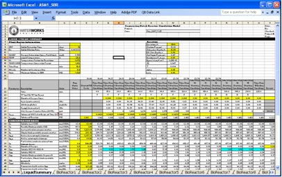 The ASM1-SBR spreadsheet was developed by Water Works Engineers as a means of modeling the performance and oxygen requirements over a single cycle of an SBR. The spreadsheet is based on the IWA Activated Sludge Model 1 and models the dynamic performance of reactor using 15 time steps. For each time step, the user specifies a volume of wastewater fed and the oxygen concentration maintained during that step. This spreadsheet is open source shareware that we are offering to the community as a collaborative product; please read the licensing terms embedded in the spreadsheet and only use it if you agree to them. Please send us any suggested improvements, comments, or enhancements so that we may share them with others.
