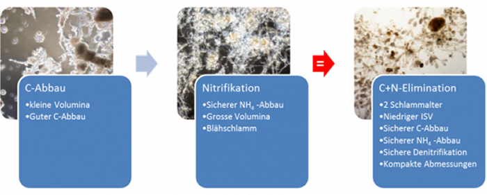 - a short flake sludge age that has a very high biological activity (C degradation, denitrification) and at the same time shows no trend towards the formation of expanded sludge (e.g. 3 days)