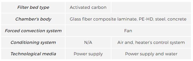 The device is composed of a chamber (made of concrete, steel, composite laminate or PE-HD) filled with filter bed (biological material or activated carbon) and forced convection system (a fan). Additionally, depending on the filtering technology used, the devices can also be equipped with air and biomass humidifying system (a conditioning system). The size of filter bed used, which determines the size of the chamber, depends on the amount of treated air and the volatile impurities concentration.