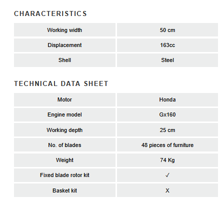 Professional scarifier , compact and reliable. The sturdy steel structure prevents any type of bending of the frame, thus allowing for extremely precise work. The fixed roller (optional) and the mobile roller, with 48 blades as standard , are interchangeable and the working depth can be adjusted millimetrically according to different needs. It has a double pulley with a double belt in the rotor transmission. The handlebar is foldable for easy transport.