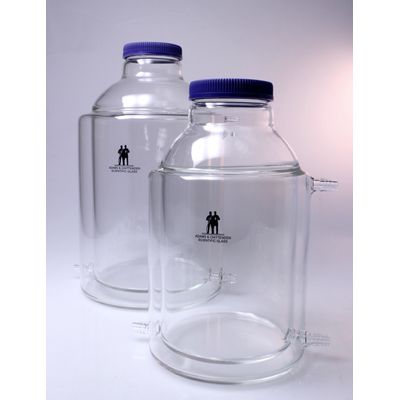 These vesels are ported at the bottom to facilitate operations. They feature the 100-440 threaded top port common for Biopharmaceutical glassware.5L and 10L volumes are shown here.