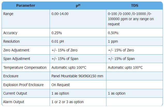 These instruments are menu driven. Auto calibration and standard self diagnostic features are incorporated. 2 Line 16 character alpha numeric backlit LCD for display. Channel 1 for pH and channel 2 for TDS. Range for each channel can be selected by menu. Two parameters will be simultaneously displayed. Independent current output for both channels (isolated 4-20 mA). Alarm can be configured. Ideal for RO plant application.