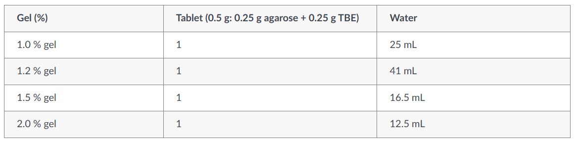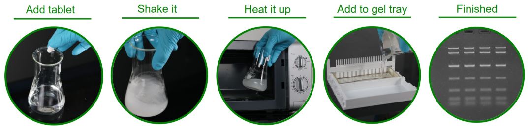 Fast dissolving molecular grade agarose tablets for DNA/RNA electrophoresis with MIDORI Green Advance DNA stain and TBE buffer.
