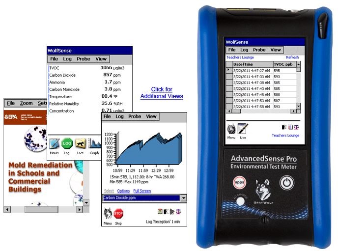 GrayWolf IAQ kits include an AdvancedSense meter (or mobile computer), plus multi-sensor indoor air quality probe, WolfSense application software, WolfSense PC desktop data transfer & reporting software, USB download cable, AC adapter/charger, meter & probe pouches and hard-shell security case. Expanded kits include TVOCs, airspeed, particulates, WolfSense Advanced Report Generation software and more.