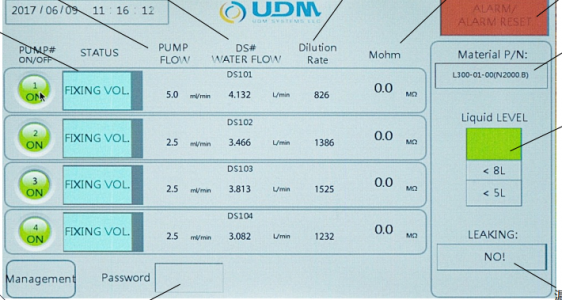 ADU-E1 series dispensers, like the original ADU series, can be configured to support from 1 to 4 dicing saws. The ADU-E1 is wired into the dicing saws so that each pump runs independently as each saw requires lubricant. The ADU-E1 can also be connected via a MODBUS TCP/IP connection, giving process engineers the ability to observe and automate surfactant consumption.