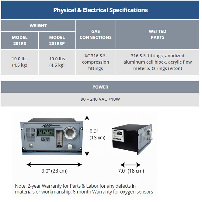 The MODEL 201RS is designed for percent oxygen measurements in positive pressure applications, while the MODEL 201RSP includes a sample pump, making it the perfect choice for measuring percent O2 measurements in atmospheric or vacuum conditions.