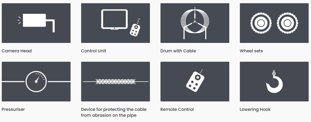 These pipe crawlers come in the following configuration: pipe crawler tractor, a motorized reel, extra sets of wheels, LED lights, electronic raising of the camera head, and a control box.
