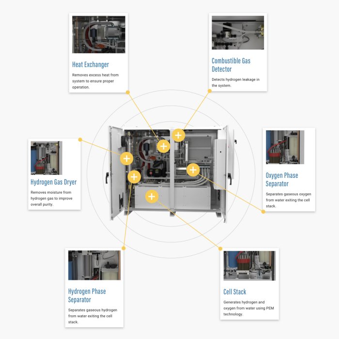 - Cell Stack: This is the main component that splits oxygen and hydrogen with the help of PEM technology