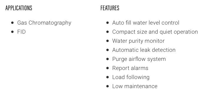 The generators can be installed easily within minutes, and it needs only deionized water and electricity to deliver consistent and pure hydrogen for lab use.