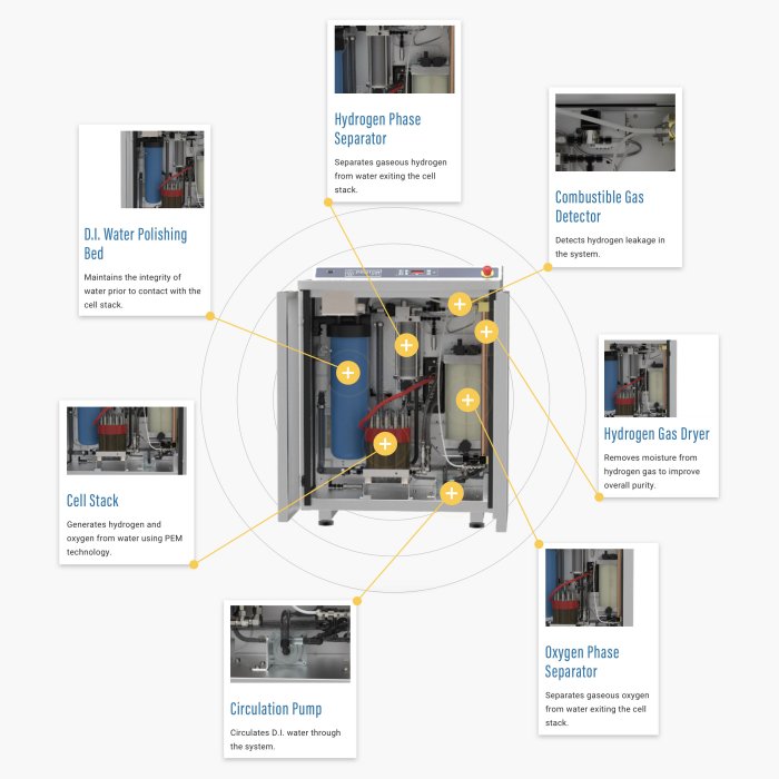 - Cell Stack – Used for splitting hydrogen and oxygen derived from water using PEM technology