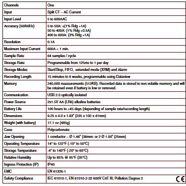 The Simple Logger II Model CL601 is a one channel recording device with an alkaline battery pack. Line tracking is performed such that 64 samples over one line cycle are taken. Frequency tracking is performed over the range of ±2Hz around the nominal line frequency 50 or 60Hz. Harmonic measurements are calculated from these 64 samples. It records TRMS at a rate of up to eight times per second. The measurement process is performed no more than eight times per second. TRMS calculations are performed on a single line cycle. This means that the inputs are ignored between measurement intervals. This logger can perform a variety of recording tasks with easy and intuitive setup from a computer using the free DataView® software included with the unit.