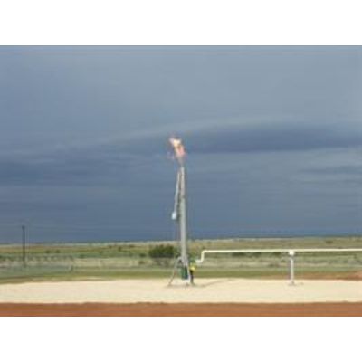 These flares will provide smokeless combustion and be Quad O and 40 CFR 60.18 compliant (>98% VOC Destruction Efficiency) with infinite turndown performance. Standard with retractable pilot systems for ease of maintenance, and supplied with guywire supports allowing for rapid onsite installation. Available in 3 in. (gas riser) x 20 ft. to 8 in. (gas riser) x 40 ft. standard sizes that will handle from 0.35 to 4.33 MMSCFD of gas flow at typical conditions (* Flows may be higher depending on available supply pressure and actual gas composition. Please ask your AEREON representative to confirm exact flow rates possible for your application). A new Cyclone HCVL (High Capacity Value Line) at 6, 8 and 10 inch diameters is also available for those that desire a simpler and lower cost tip design that removes the proprietary AEREON Starfire burner tip in lieu of a concentric riser design that promotes mixing and smokeless combustion.