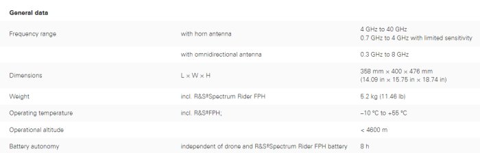The standard horn antenna covers a nominal frequency range from 4 GHz to 40 GHz. It can also be used from 700 MHz with reduced sensitivity. Additionally, the R&S®AMS-OMNI1 omnidirectional antenna with a frequency range from 300 MHz to 8 GHz is available as an option. For both antennas, the polarization can easily be changed by rotating the antenna while the drone is still on the ground. Power is supplied via a battery pack. It is the same type as the one used in the R&S®Spectrum Rider FPH. A battery charger is included.