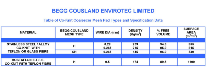 The Becone Coalescer unit is a pad fabricated from a co-knitted composite fabric consisting partly of monofilaments and partly of a staple fibre yarn. These fibres are much smaller in diameter than either the yarn into which they are spun or the monofilaments – consequently forming a more efficient filter.