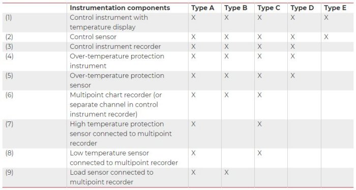 Control instrumentation type is defined as Type A, B, C, D or E. The differences between these types are shown in the diagram below and relate to the number of recording thermocouples permanently installed in the work-space of the furnace and the instrumentation used to monitor these.