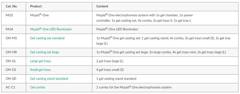 The Mupid® One comes with the Gel casting set standard (Cat.No. ON-MS). This casting set includes 4 combs, which can be used from both sides (13 wells and 26 wells). Furthermore, this set comes with different gel trays: Two gel trays small (S) for the preparation of mini gels and one gel tray large (L) for larger gels. The optional gel casting set GM-HR includes 2 large combs and two different gel trays: 4 gel trays small (S) and two gel trays large (L).