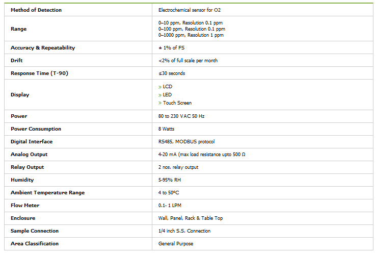 Agasthya 2013 Series Trace Oxygen Analyzer BI 300 measures Traces of Oxygen in ppm level in process gas. For O2 measurement Electrochemical technology is used. Easy to maintain and service from user point of view. LCD, LED & Touchscreen display available. Analog 4-20 mA output with 2 nos. relay contact. It has 4 different mounting configurations, Wall, Panel, Rack & Tabletop.