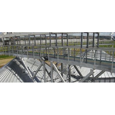 Wherever possible, AGI FRAME utilize catwalk support frames rather than independent towers, reducing civil & installation costs. Catwalk supports also known as goal posts are galvanized frames omega or C-shaped, designed to support any type of catwalks and so conveyors ensuring the widest range of applications utilizing standard components wherever possible. It is possible to provide single goal post, where the connection is located on one silo, or double goal post where the connection is located on two silos. When possible, it can be added a rafter to a single goal post in order to provide the most cost-effective. Its design meets every project requirement.