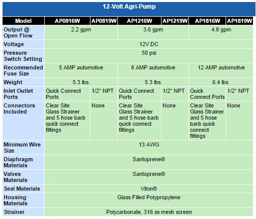 Weatherproof Tested: The only 12-Volt Pump to be totally protected against weather, dust and overspray and backed by a 2-year warranty. 4 Piston Diaphragm: For a smoother flow. Quick Connect Ports System: The quick connect port systems means it`s faster to install, requires fewer parts and connections while reducing the number of potential leak points. Integral Pressure Switch: The integral pressure switch is fully sealed. Low Current Draw: Resulting in a longer battery life. Automatic Demand. Chemical resistant construction suitable for most fertilizers and chemicals. CDS-John Blue Company offers a 2-year warranty.