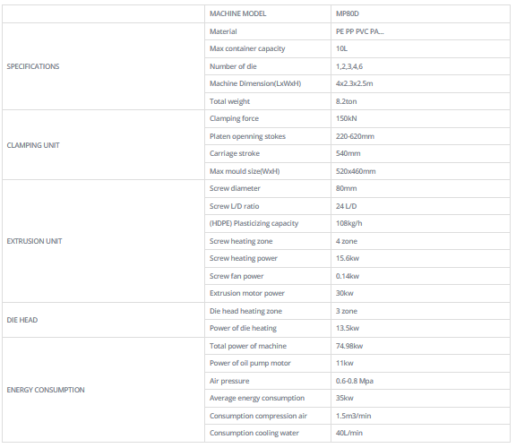 MP80D extrusion blow molding machine is specifically designed for making bottles from 10ml up to maximum 10L. It is hydraulic driven with accrate eletrical control system. MP80D has double stations to increase the production efficiency. Also, it has variety of choice of die heads. With more than 10 years of success in the market, MP80D is updated to be one of the most reliable and popular model in the world.