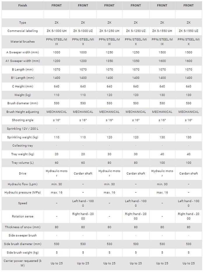 The sweepers can be delivered with PTO drive speed 1000 rpm, left hand rotation, or 2000 rpm, right hand rotation in driving direction (UZ version), or with hydraulic drive (UH version).