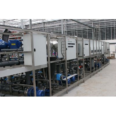 Because of the high salinity without treatment, well water can often not be used as irrigation water. Reverse osmosis (RO) is a filtration method that removes types of large molecules and ions from solutions by applying pressure to the solution when it is on one side of a selective membrane. The result is that the brine is retained on the pressurized side of the membrane and the pure solvent is allowed to pass to the other side. High bicarbonate level in irrigation water can be treated by using a Neutralizer unit. The Neutralizer adds acid to the fresh water and mixes it thoroughly in a specially designed mixing chamber. The Neutralizer can be used when fresh water is pumped into a fresh water storage silo, or when fresh water is circulated through the Neutralizer.