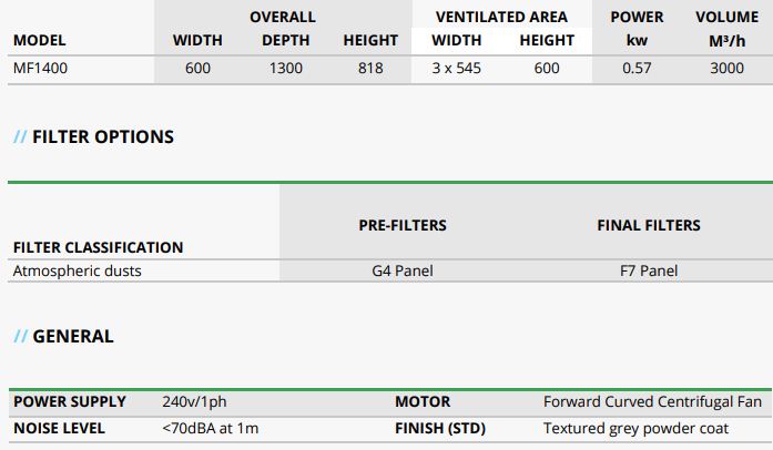 The MF1400 is a simple air cleaner designed to capture dust and particulate from your workspace and return clean air to the room. Air is drawn in through the G4 grade prefilters; through a secondary F8 bag filter, and exhausted from the rear via an adjustable grille. Inlets on 3 sides provide improved air cleaning function. MF1400 can, as an alternative and when supplied without castors, be placed on shelving or suspended from ceiling cables to improve general air cleanliness within your facility. These units require only a single phase supply and come complete with pressure gauge indicator to show when filters require changing.