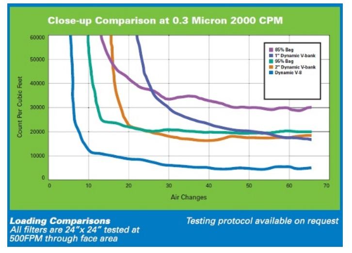Figure 1 The graph above shows particle counts at 0.3 microns as a function of air changes in an AHAM chamber. The Dynamic V8 surpasses all others with its superior dust holding capacity.