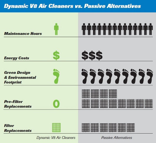 The V8 operates at MERV 13-15 effectiveness, but boasts ten times or more the dust-holding, to provide the lowest cost of ownership, the flattest loading curve, and the longest maintenance cycle of any air cleaner on the market. This allows for smaller fans in new construction and significant energy and operational savings in virtually any application. A standard passive filter array uses up to three times more energy.