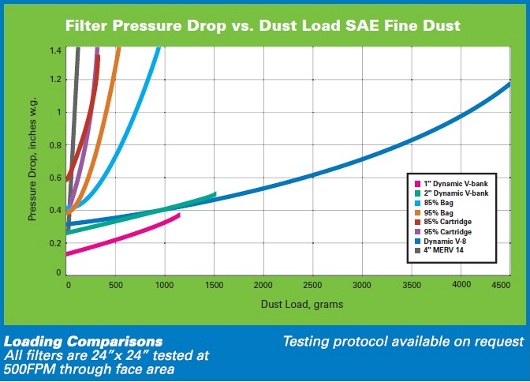 Superior loading also flattens the pressure drop curve to save over 1” of static. This means big energy savings and the potential for smaller fan selection. Energy costs are a major concern for facility managers and are, at current rates, typically 80-85% of the cost of filtration, far outweighing initial filter cost. A MERV 14 cartridge filter array with pre-filters will consume three times more energy than a Dynamic V8.