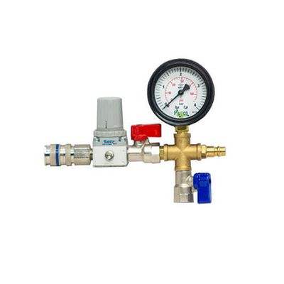 Materials: Pressure Gauge (0- X Bar). Protective Cover for Pressure Gauge. Nipple for Quick Release Coupler, Brass. Quick Release Coupler, Brass Nickel Plated. Supply and Discharge Mini Ball Valves for Plug Deflation. Pressure Regulator. 4 Way Connector. Nipple.