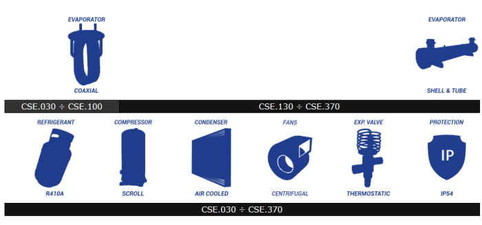 - Evaporator: Coaxial (CSE.030÷CSE.100) or Shell & Tube (CSE.130÷CSE.370)