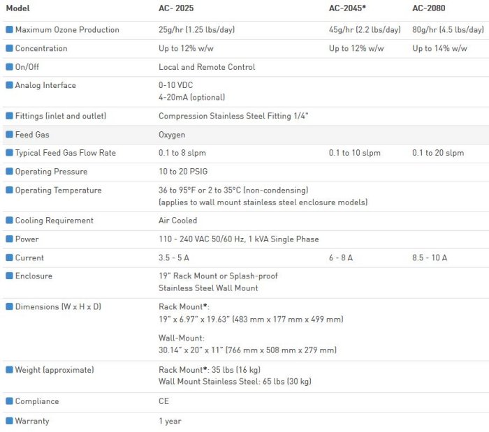The AC series of ozone generators offers silent corona discharge technology in a very compact package. The ceramic-based, industrial grade ozone generators are capable of producing concentrations of ozone in excess of 200 g/Nm3 or 14% w/w. The AC series generators are available in a 19 inch rack-mount enclosure or a rugged, wall-mount enclosure designed for harsh and demanding industrial environments. For ease of use, each AC series ozone generator has an integrated controller enabling it to operate in local or remote mode. The built-in forced air cooling system is designed to efficiently circulate air through the system to cool the ozone generating cell and internal power supply. The only maintenance required is periodic replacement of the cooling air filters.