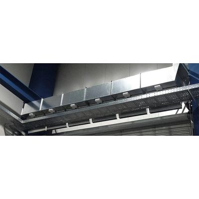 The LK air curtain makes a significant contribution to reducing the amount of cold air entering the hall when the hall doors are opened frequently. How it works: The air preheated by the hall heating is sucked in from the upper part of the hall via individual ventilation modules and guided downwards through specifically adjustable slot nozzles in front of the door. The high air speeds that are effective in this process significantly reduce the amount of cold air flowing into the hall: the hall remains warm throughout . The LK air curtain is available in “unheated” and “heated” versions; the latter is mainly used in sensitive production areas.