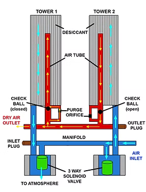 The DryAir range uses regenerative PSA technology to remove water vapour from compressed air. Wet air is directed into one of the two desiccant chambers, where nearly all of the water vapour is removed. A small portion of the laboratory air dryers outlet gas is redirected back through the off-line desiccant chamber, purging it of the accumulated moisture. The drying cycle alternates between the two chambers continuously. The unit is available in a custom enclosure with filtration and buffer tank or as an OEM module for integration into 3rd party equipment.