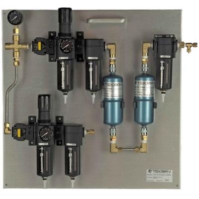 The Tekran Model 1304 Air Filtration System is an inexpensive, convenient conditioning unit for plant compressed air. The Series 3300 Mercury CEM requires two types of air in order to operate. Motive air is required to drive the inertial filter sample flow via an eductor. Zero Air is used for dilution and for the generation of calibration gas. Both types of air should be dry, oil free and particulate free, however the Zero Air is also scrubbed of all traces of mercury. The Model 1304 can supply enough air for two CEM systems. The long-life filter elements and mercury scrubbers are simple to change, inexpensive, and last in excess of one year under normal operating conditions.