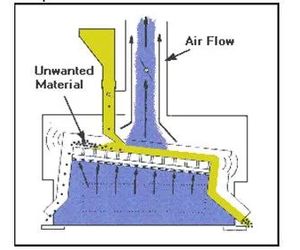 Product is fed onto the oscillating deck towards the higher end. A uniform current of air is drawn through the porous deck by an external fan or plant ventilation system. The lighter weight material flows down and the heavier material, not being supported by the air stream, is carried to the upper end of the deck by the deck motion and discharged. Our design is virtually free of vibration, dustproof and has infinitely variable air control. The deck may be removed quickly and easily for cleaning. Power requirement is low and installation is simple and inexpensive.