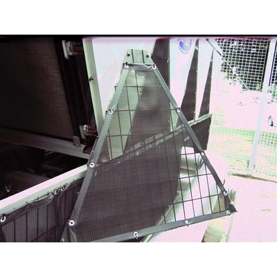 • Model BHA is constructed with one layer of black PVC-coated polyester high-abrasion media, encased in a sewn vinyl edge with double row stitching and attached via stainless steel grommets. This media meets NFPA-701 Flame Resistance.