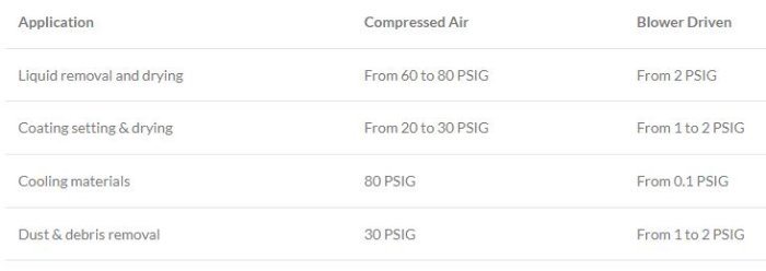 Blower driven air knife systems offer a distinct advantage over the compressed air equivalents as much lower pressures are required with a blower driven system to achieve the same result. Upto 90% savings in terms of energy costs are therefore not un-common. The following table illustrates typical pressures required as a comparison.