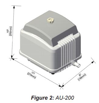 (Optional Accessory) AU-200- 1/2 HP (375 watt) rated air pump unit capable of producing 6.0 standard cubic feet per minute (0.17 standard cubic meters per minute) @ 4.0 psi (27.6 kiloPascal). 100% duty-cycle. Connection: Stem for 3/4” I.D. hose. Powered by an air pump with a maximum diffuser submergence depth of 12ft (3.7M). Weather resistant construction, suitable for outdoor use. Ensure unit receives proper shade and ventilation to reduce chance of overheating. (See Figure 2)